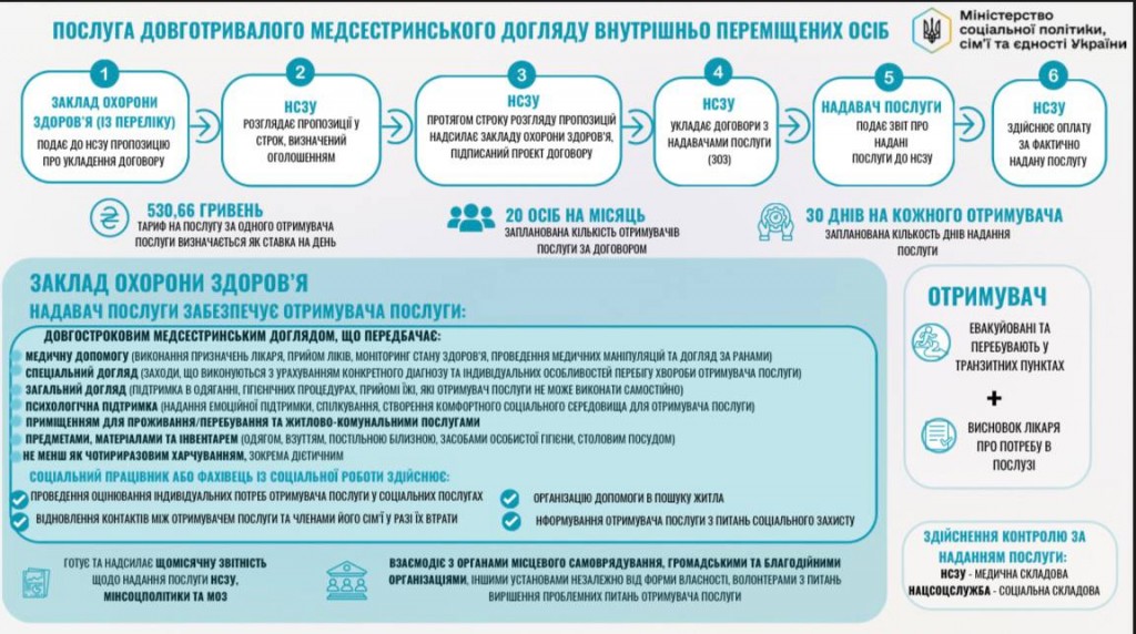 - надання довготривалого медсестринського догляду - для внутрішньо переміщених осіб, яких евакуйовано до транзитних пунктів (до 30 календарних днів у закладах охорони здоров’я за висновком лікаря);