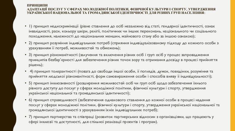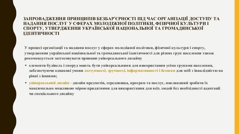 23. Методичні рекомендації щодо запровадження принципів безбар'єрності під час надання послуг у сферах молодіжної політики, фізичної культури і спорту, утвердження української національної та громадянської ідентичності